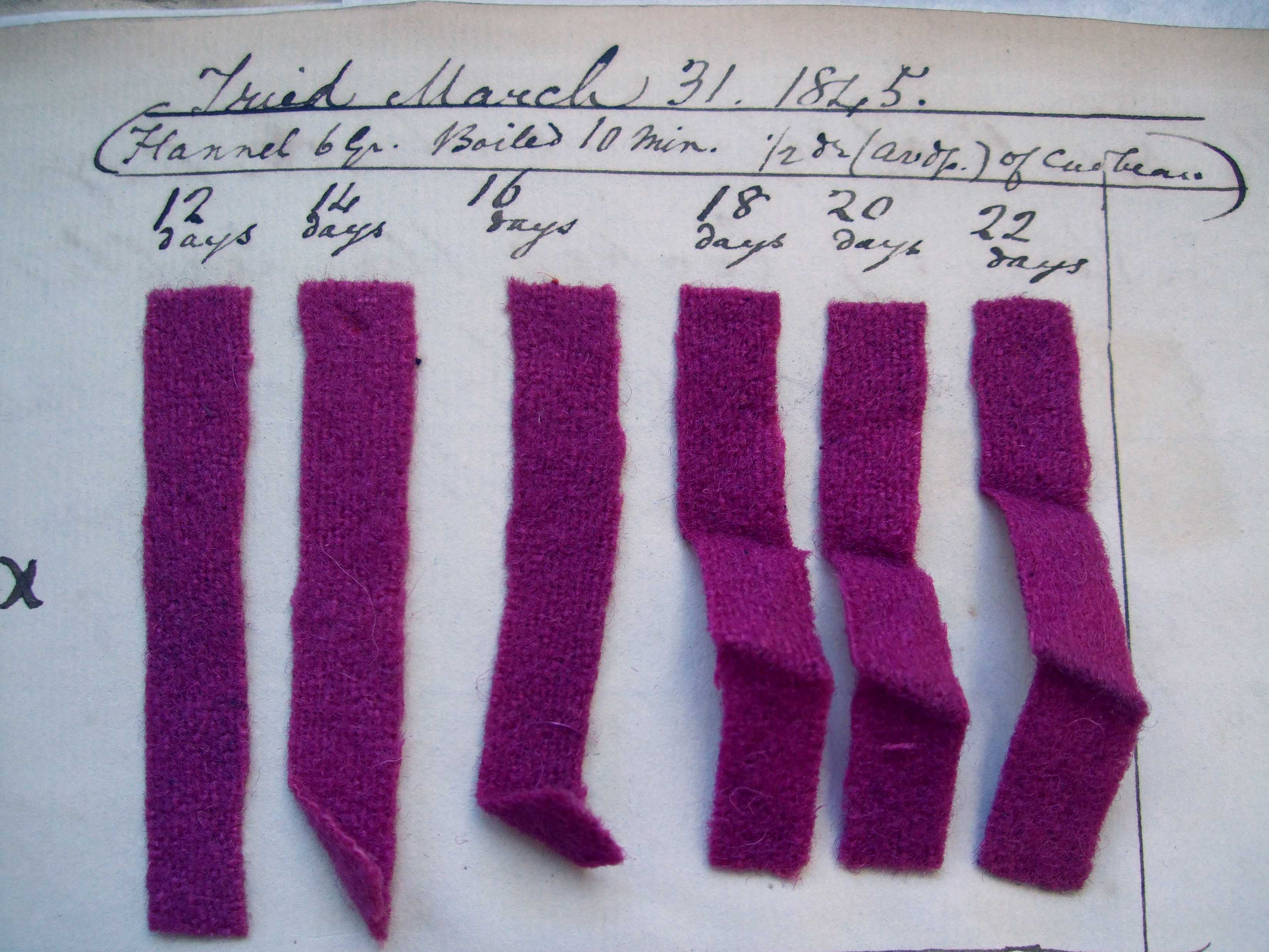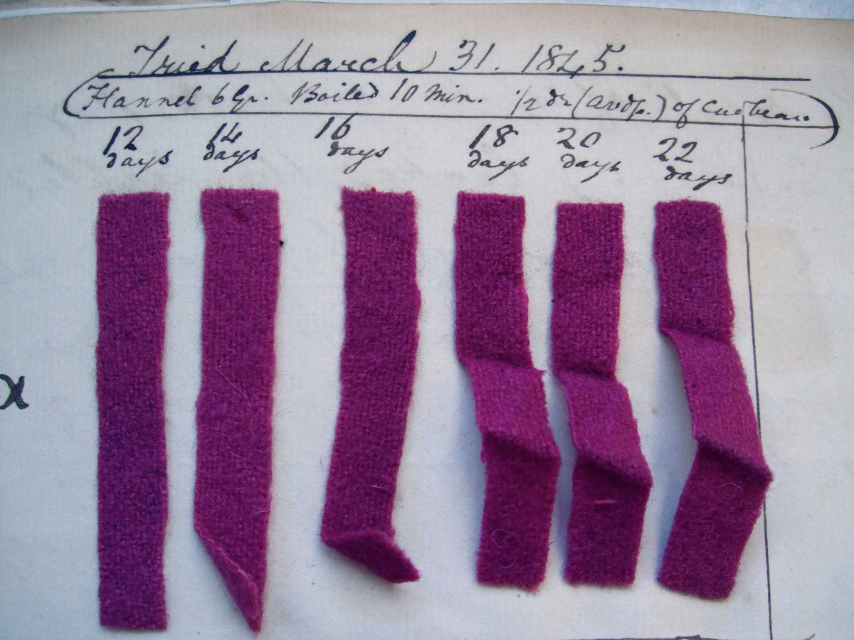 accurate orchil January 7, 2013 by Persicaria Leave a comment Nineteenth century dyer’s notebook showing orchil-dyed flannel